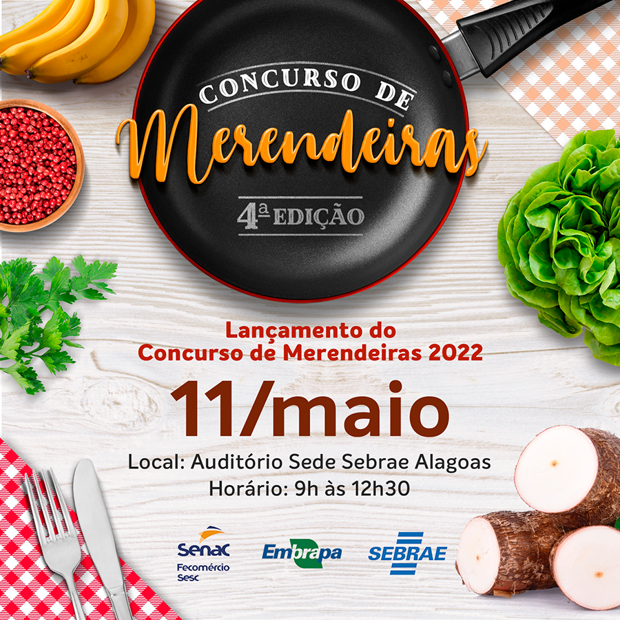 Em parceria com o Senac e a Embrapa, o Sebrae Alagoas lança, no próximo dia 11, a partir das 9h, em seu auditório, a edição 2022 do Concurso de Merendeiras de Alagoas. Estarão presentes nutricionistas e secretários de Educação dos municípios atendidos pelo programa Cidades Empreendedoras. O prazo de inscrições para o evento de lançamento termina às 9h do próprio dia 11.