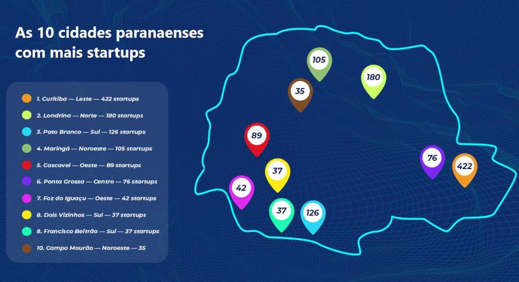 Em relação à localização, o estudo apontou que Curitiba é a cidade com mais startups, com 422; seguido de Londrina, com 180; Pato Branco, com 126; Maringá, com 105; e Cascavel, com 89. O estudo aponta ainda que cerca de dois terços do total de startups não estão na capital ou próximas a ela, com destaques para as regiões Norte e Sul do estado. Ao todo, 87 dos 399 municípios paranaenses registaram pelo menos uma startup.