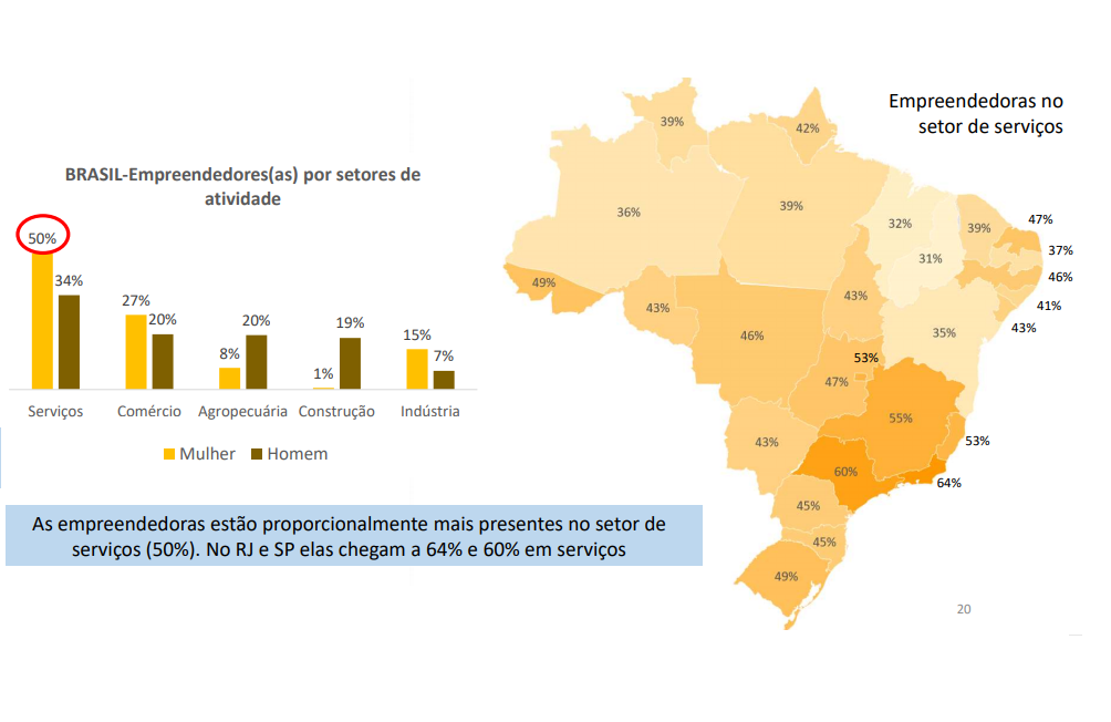 Na distribuição de empresas com gestão exclusivamente feminina, o segmento de serviços lidera a concentração de negócios. Segundo pesquisa do Sebrae divulgada nesta sexta-feira (5), 47% das empresárias do Rio Grande do Norte escolheram esse segmento para empreender. O segundo macrosegmento com maior número de empresárias é o do comércio, que reúne 35% dos negócios das empreendedoras potiguares, enquanto a indústria totaliza 10%. As mulheres à frente de empreendimentos da área da construção civil representam 1,4%, a terceira maior concentração do país, atrás dos estadosde Roraima (1,9%) e do Paraná (2,1%).