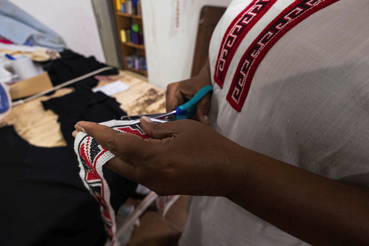 “Todas essas aí já estão encomendadas, não tenho nenhuma para vender nesse momento”, completou dona Cruz, apontando para as cerca de cinco camisas penduradas em um varal na sala. Para produzir uma camisa, ela leva cerca de uma semana, considerando o bordado do galão, costura da nervura e fixação na roupa.