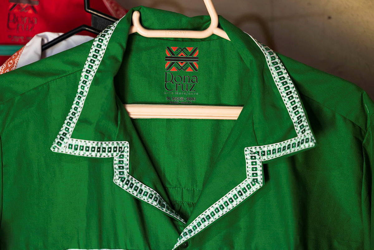 “Todas essas aí já estão encomendadas, não tenho nenhuma para vender nesse momento”, completou dona Cruz, apontando para as cerca de cinco camisas penduradas em um varal na sala. Para produzir uma camisa, ela leva cerca de uma semana, considerando o bordado do galão, costura da nervura e fixação na roupa.