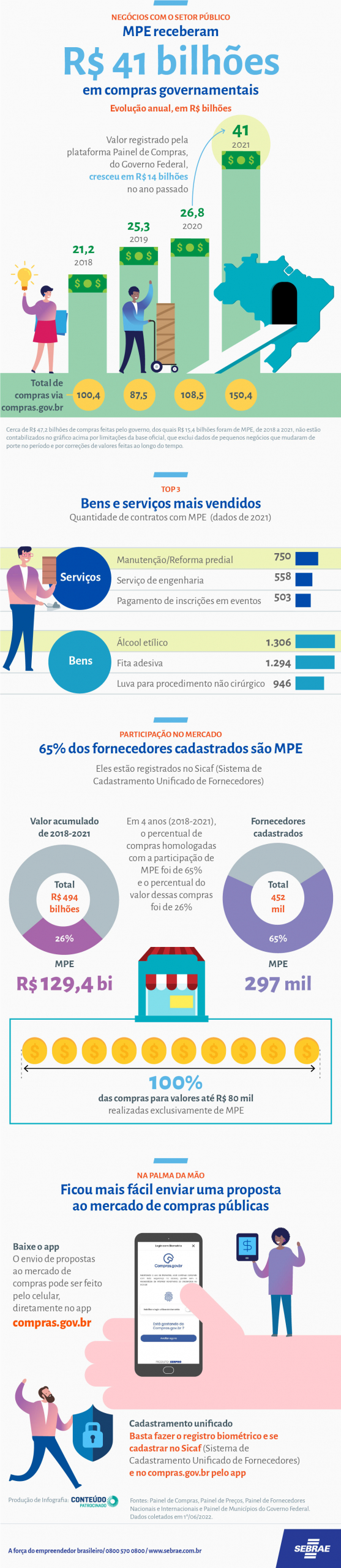 Levantamento feito pelo Sebrae mostra que as micro e pequenas empresas movimentaram R$ 41 bilhões em compras governamentais em 2021. Esse volume representou um crescimento de R$ 14 bilhões, quando comparado ao ano anterior. Em quatro anos (2018-2021), o percentual de compras homologadas com a participação de MPE foi de 65% do total. Esses pequenos negócios responderam por 26% do valor dessas compras públicas.