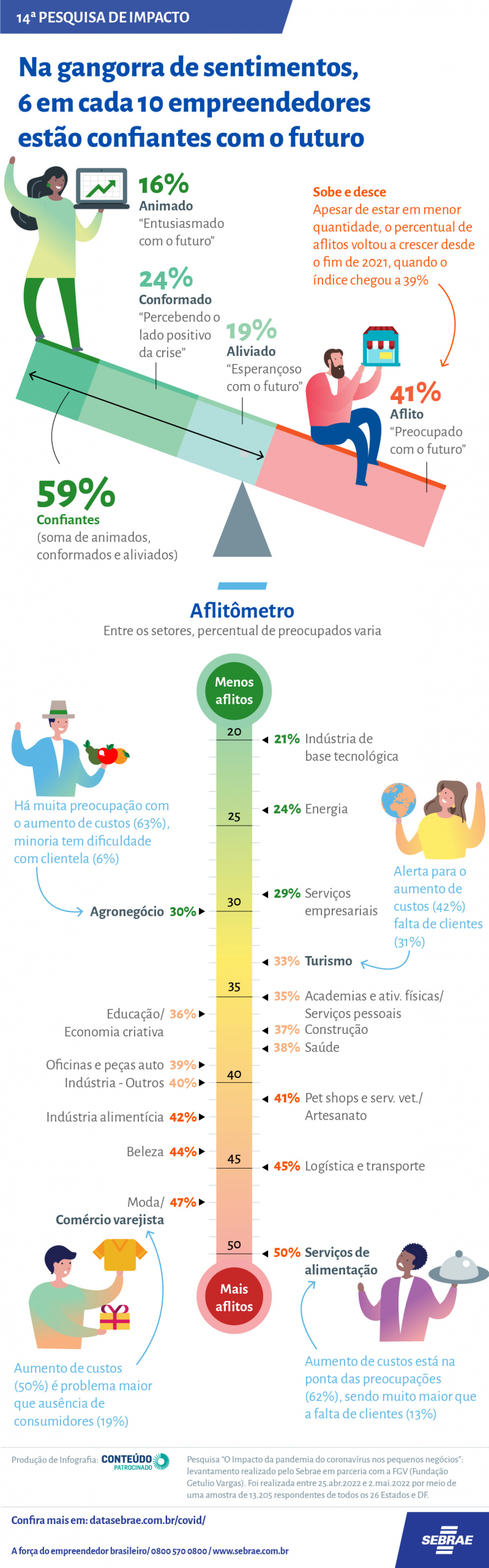 Pesquisa realizada pelo Sebrae e Fundação Getúlio Vargas revelou, em maio de 2022, que 6 em cada 10 empreendedores estavam confiantes com o futuro. 16% dos donos de pequenos negócios ouvidos estavam entusiasmados com o futuro, 24% percebiam o lado positivo da crise, 19% estavam esperançosos com o futuro e 41% estavam preocupados com o futuro.