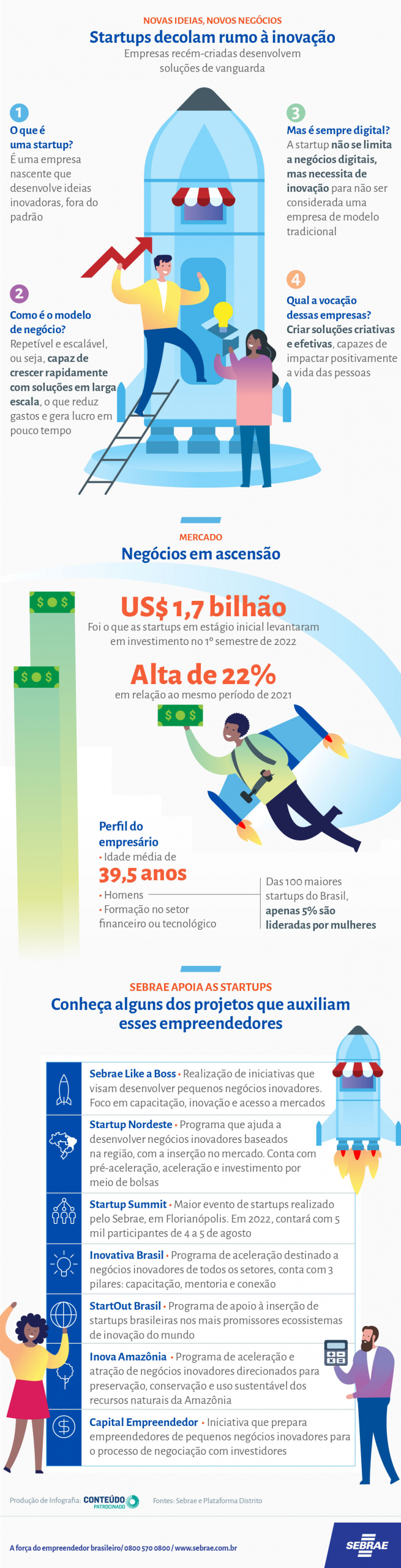 Levantamento feito pelo Sebrae mostrou que as startups em estágio inicial levantaram US$ 1,7 bilhão em investimentos no 1º semestre de 2022. Esse montante representa um crescimento de 22% em relação aos valores movimentados no mesmo período do ano anterior. O Sebrae oferece um conjunto de ações voltadas a esse universo: Capital Empreendedor, Inova Amazônia, Startout Brasil, Inovativa Brasil, Startup Summit, Startup Nordeste e Sebrae Like a Boss.