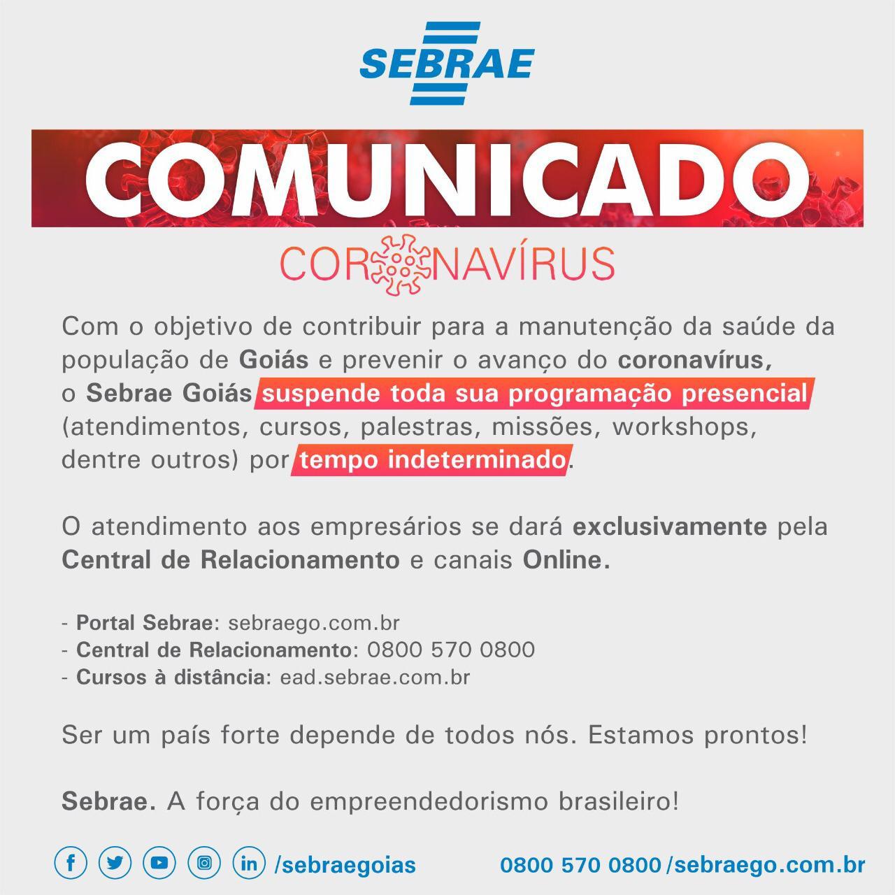O Serviço de Apoio às Micro e Pequenas Empresas (Sebrae Goiás), em virtude de medidas preventivas ao avanço do coronavírus, conforme orientações da Organização Mundial de Saúde (OMS), do decreto estadual no. 9.634, de 13/3/2020, e de deliberações do Sebrae Nacional, SUSPENDE, POR TEMPO INDETERMINADO, toda sua programação de atendimento presencial, cursos, palestras, missões nacionais e internacionais, workshops, seminários, e manterá todo o seu atendimento remoto pelas vias on line (www.sebraego.com.br), pela Central de Relacionamento Sebrae 0800 570 0800 e os cursos on line no Ensino à Distância (EAD) pelo link www.ead.sebrae.com.br